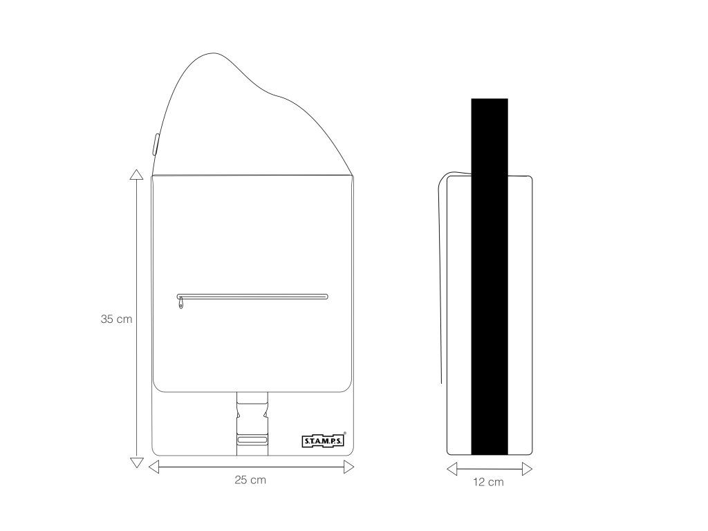 Na přední straně najdete decentní kovovou destičku s logem S.T.A.M.P.S, která dodává tašce jedinečný styl.